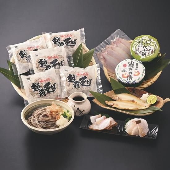 小鯛ささ漬(半樽) 70g/千枚小鯛(半樽) 80g/かれい一夜干し(小) 5尾/越前そば(生) 100g×5食 つゆ付