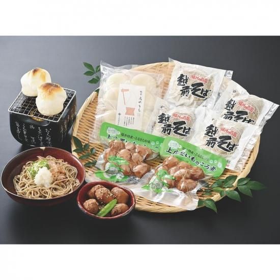 越前そば(生) 100g×4食つゆ付/上庄里いものころ煮 200g×2袋/越前名水丸もち×6ヶ 【アレルギー】小麦/そば 【賞味期限】14日