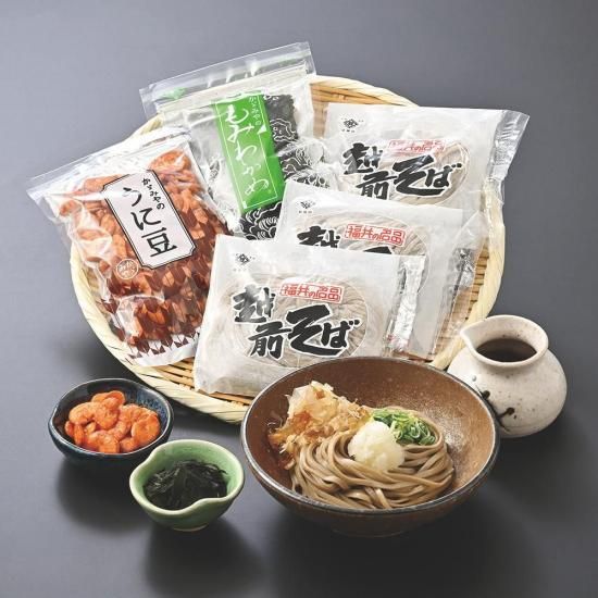 もみわかめ 20g/うに豆 90g/越前そば(生) 100g×3食つゆ付 【アレルギー】小麦/卵/そば 【賞味期限】14日